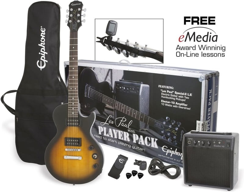 Epiphone Les Paul Player Pack oferuje wszystko, czego potrzebujesz aby rozpocząć swoją przygodę z grą na gitarze. Jego głównym elementem jest Les Paul Special-II, wyposażony w parę klasycznych humbuckerów. Ponadto w komplecie znajduje się wzmacniacz Electar 10W, trzymetrowy przewód gitarowy, tuner chromatyczny w postaci klipsu, pasek gitarowy, kostki gitarowe, wygodny pokrowiec gitarowy oraz zestaw lekcji wideo przygotowanych przez eMedia (rock, blues, folk, country, hard rock, metal oraz inne style)
