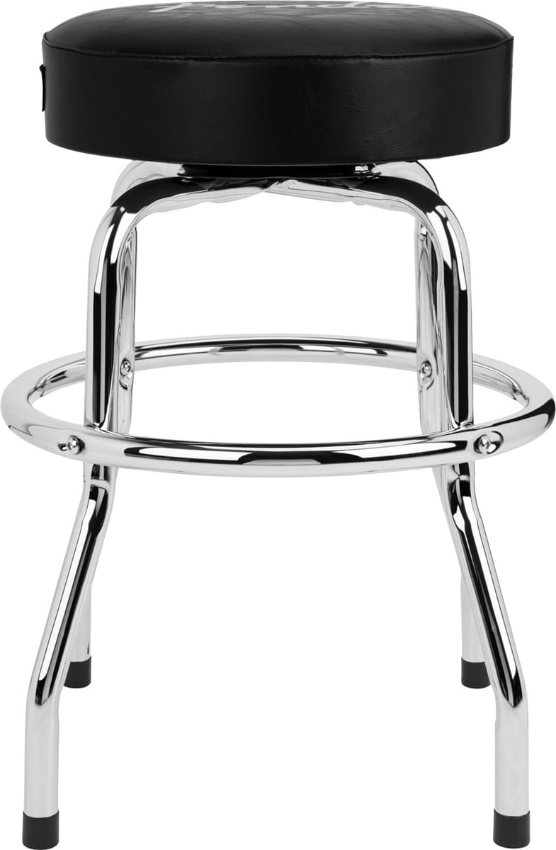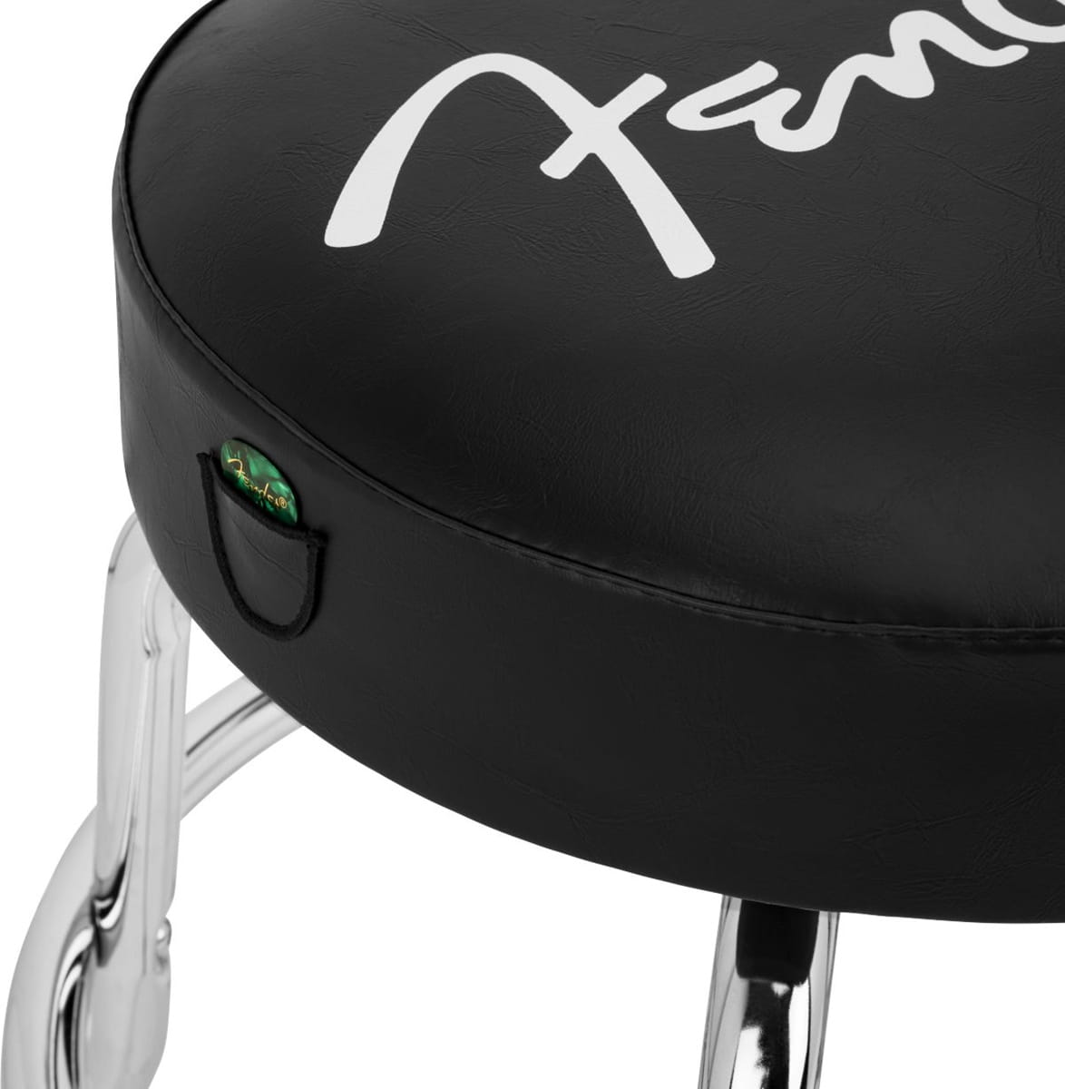 stołek z kultowym białym logiem Fender „spaghetti” oraz chromowanymi nogami