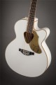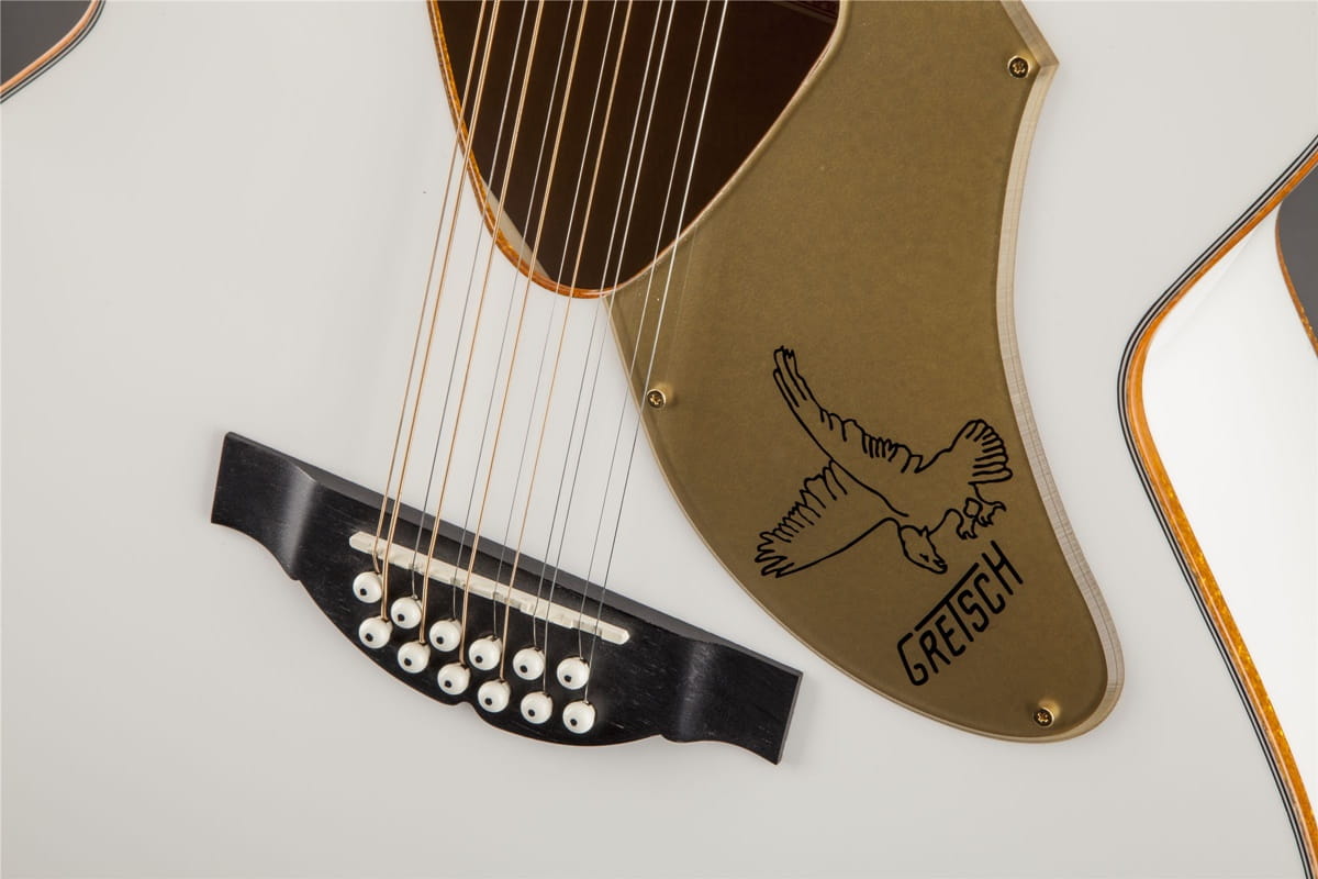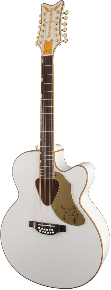 G5022CWFE-12 Rancher Falcon Jumbo 12-String zapewnia bogaty pełny 12-strunowy dźwięk z pełnym brzmieniem Gretsch Falcon, pozłacanymi elementami i wbudowaną elektroniką dla niezrównanego, wzmocnionego brzmienia. Korpus jumbo cutaway jest wykończony w błyszczącym białym kolorze, z olśniewającym złocistym połyskującym bindingiem na górze i z tyłu korpusu, w otworze dźwiękowym, na podstrunnicy i główce.