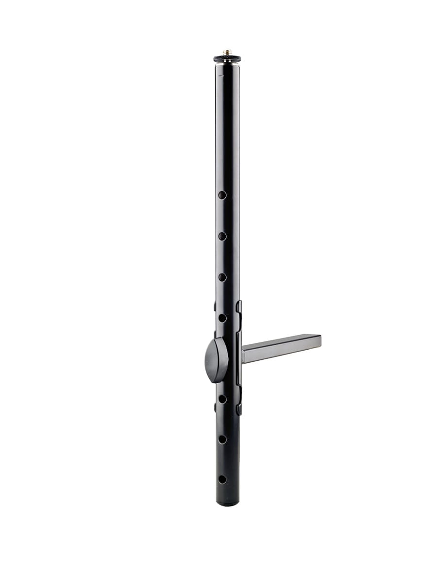 Regulacja wysokości pionowej rury jest możliwa dzięki 8-stopniowej skali, co pozwala na precyzyjne dopasowanie do indywidualnych potrzeb użytkownika. Uchwyt posiada gwintowane złącza w standardzie 3/8" lub 5/8", umożliwiające zamontowanie dodatkowych akcesoriów, takich jak ramiona wysięgnikowe, gęsia szyja, uchwyty na iPada czy tablety.